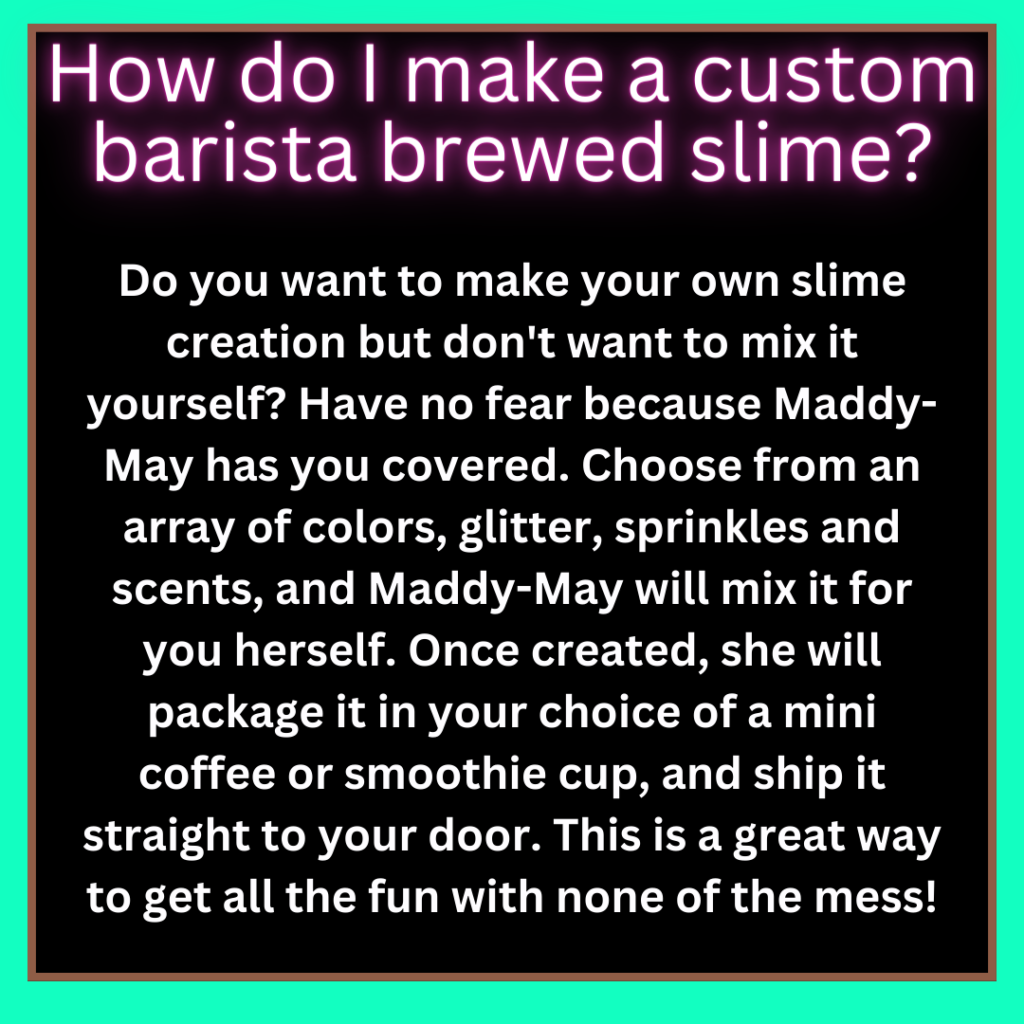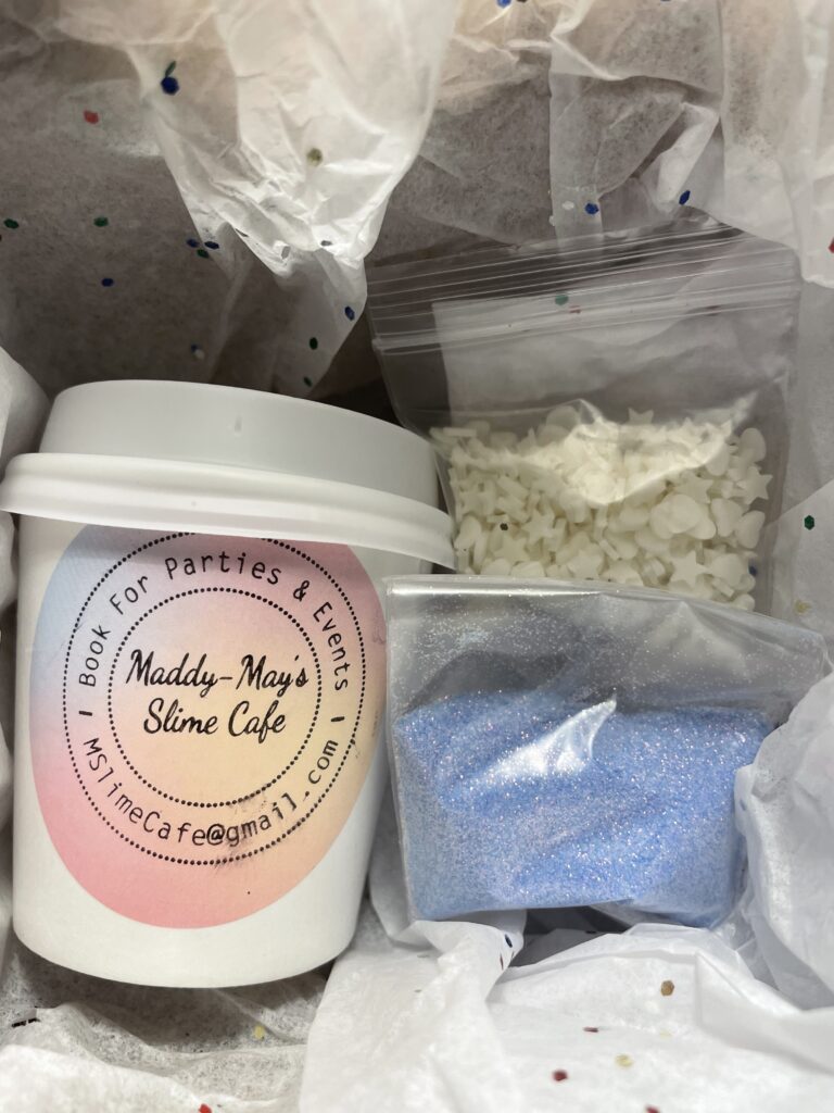 Welcome to Maddy-May’s Slime Café! A place where people come to stretch, squish & smile their way through the WINTER season. Maddy-May’s slime is non-sticky and specially formulated to allow people of all ages to enjoy squishing and stretching without the mess!